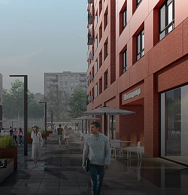 Это будет Дизайнерский дом комфорт-класса с двумя 18-этажными башнями терракотового цвета, увеличенными окнами, панорамным остеклением лоджий и эксплуатируемой крышей, откуда собственники квартир могут наблюдать: город, красивые рассветы и закаты над Волгой.