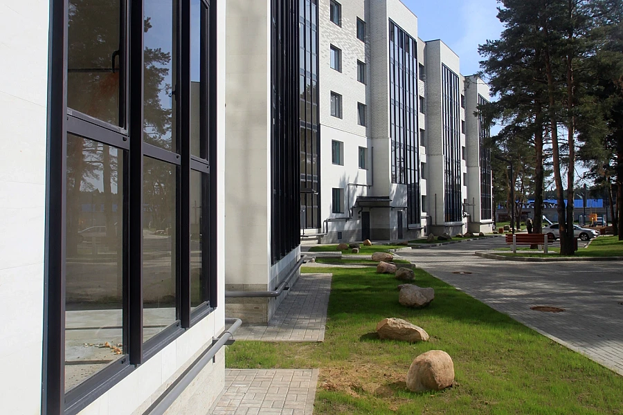 Современный пятиэтажный жилой комплекс, созданный с уважением к природе и вниманием к деталям. Архитектура подчёркнута элегантными линиями и панорамным остеклением, наполняющим пространство светом и открывающим виды на сосновый бор.