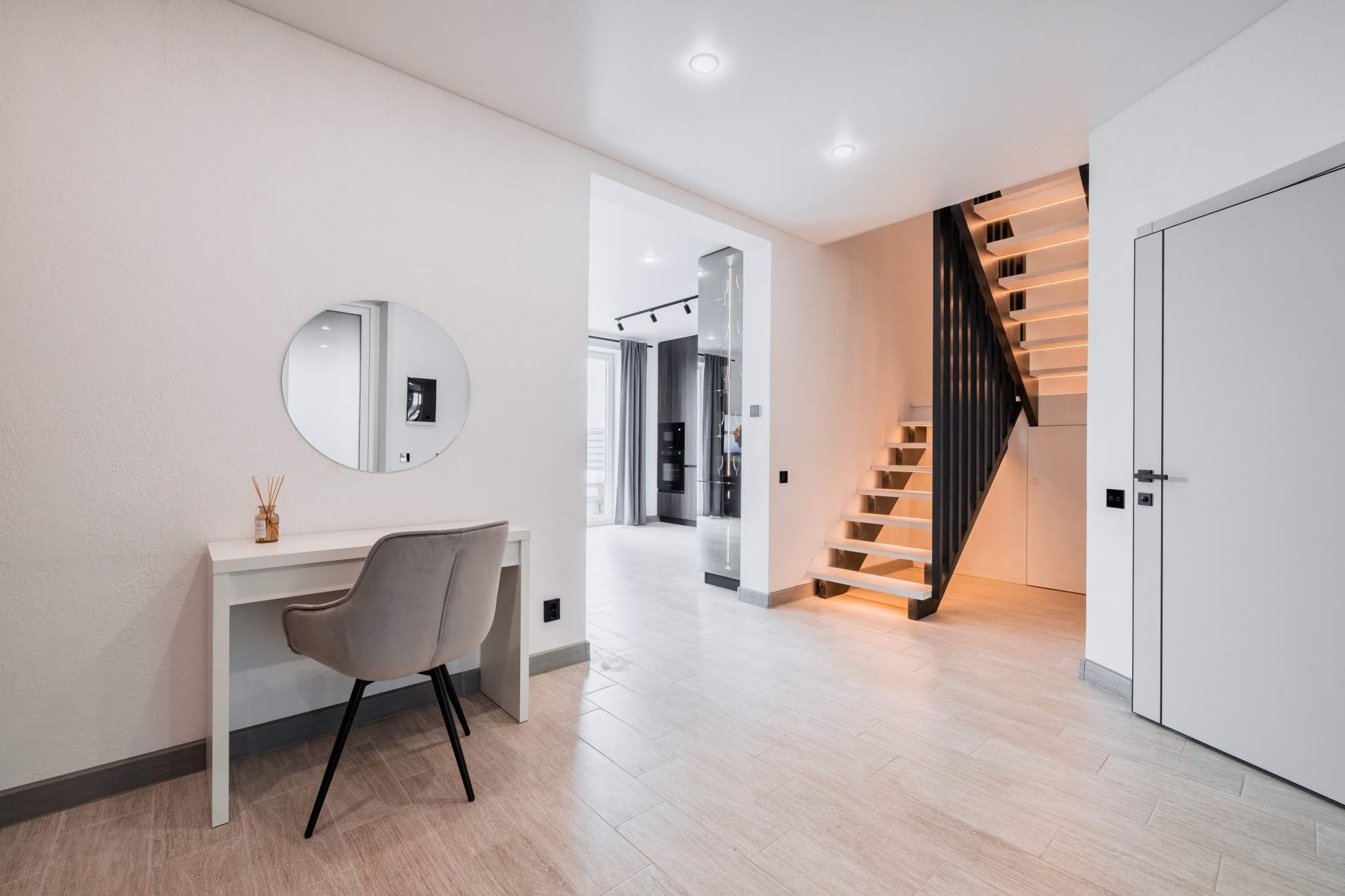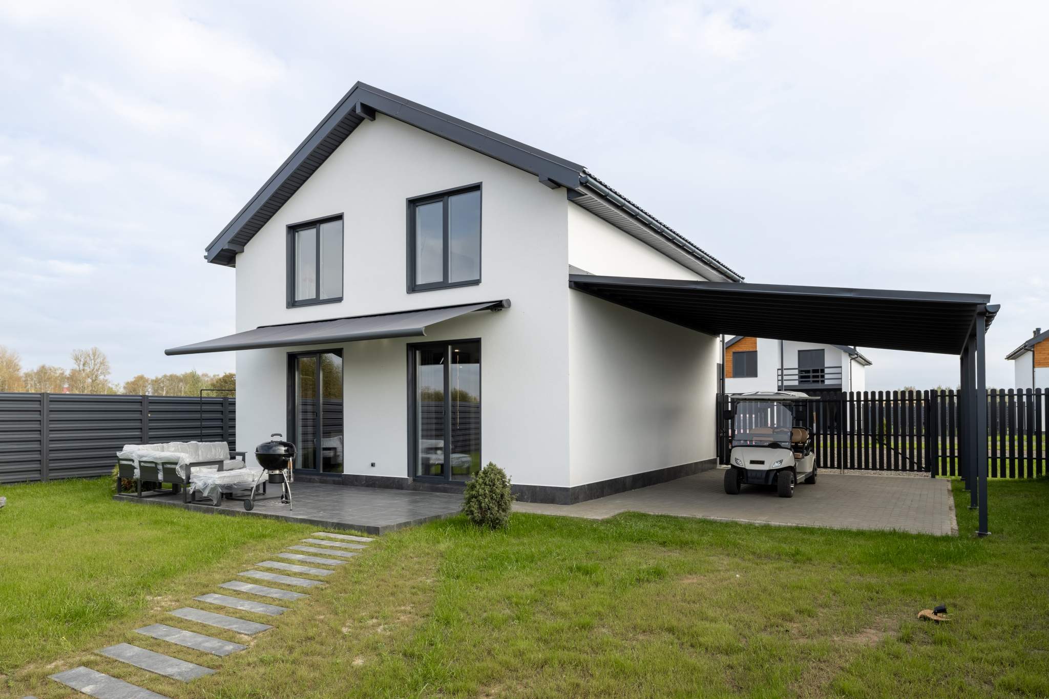 Жителям дома доступны три удобных места для парковки. Элегантный газон, украшающий фасад, наполняет атмосферу теплом и гостеприимством. На первом этаже расположены просторное фойе, гостевой туалет и уютная студия. Второй этаж предлагает три уютные комнаты и дополнительный санузел. Дом оснащен всеми необходимыми коммуникациями, что делает его прекрасным вариантом для постоянного проживания. Система теплого водяного пола на протяжении всех этажей обеспечивает уют и тепло в холодное время года.