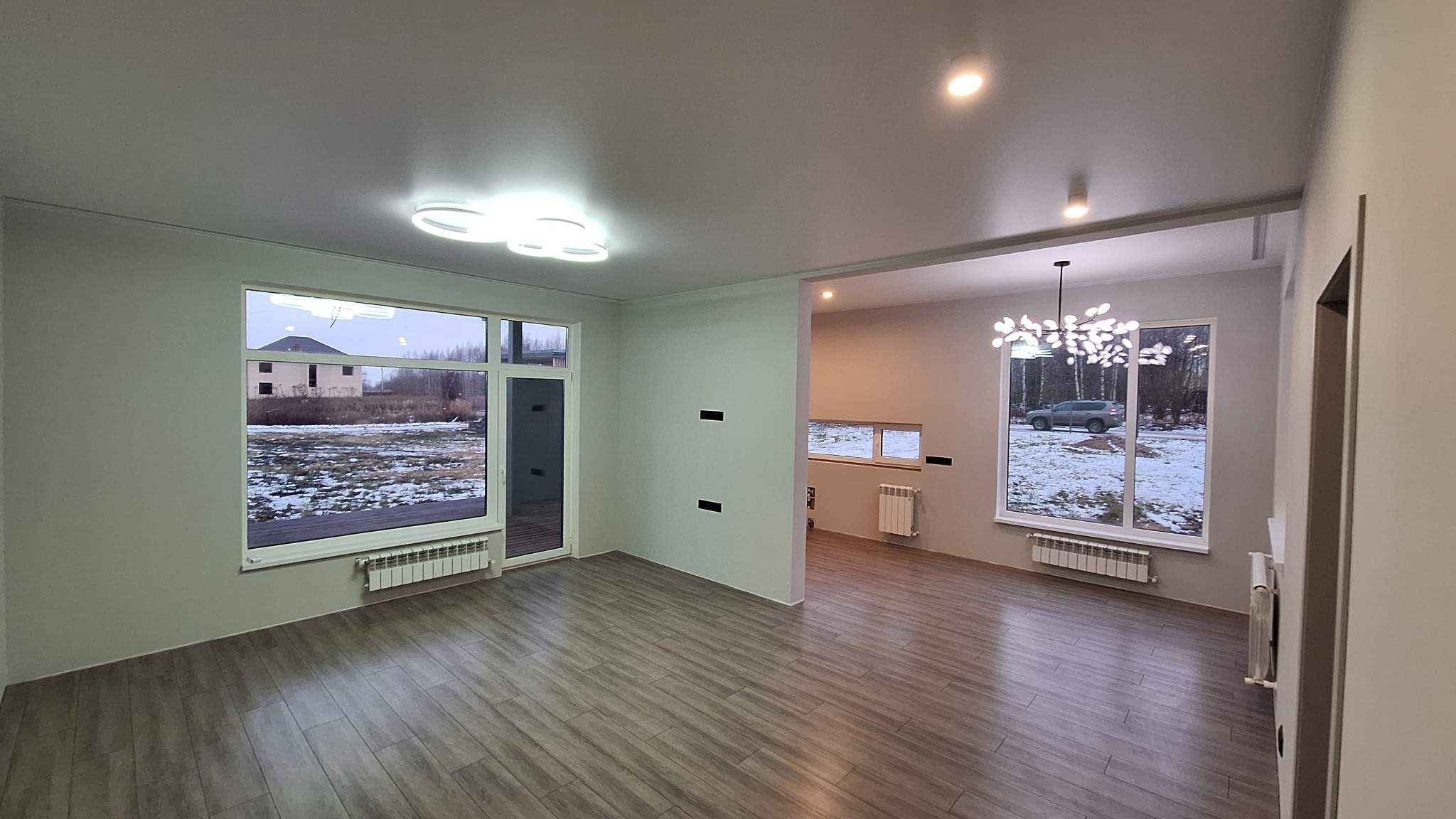 Дом 100 кв.м., построен по финской технологии, с двумя террасами + 50 кв.м. к площади дома, панорамным остеклением, удобная планировка: 3 спальни, просторная гостиная с кухонной зоной, высокие потолки 3 м – много света и воздуха.