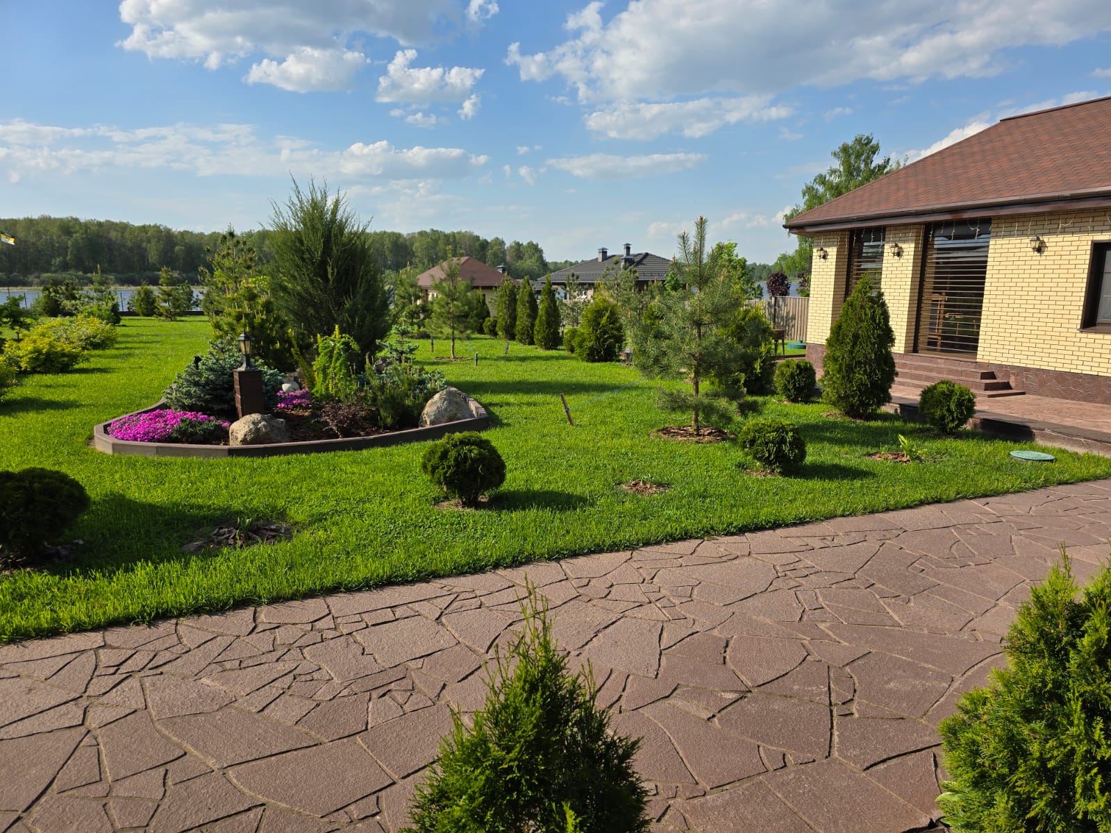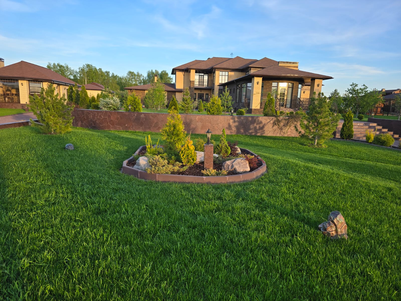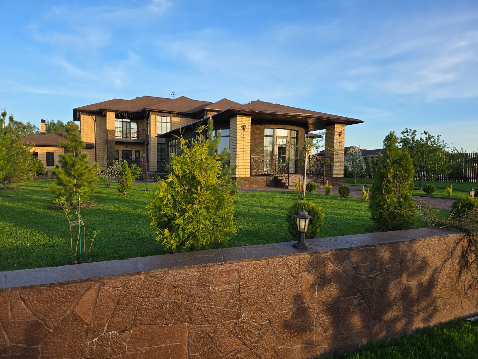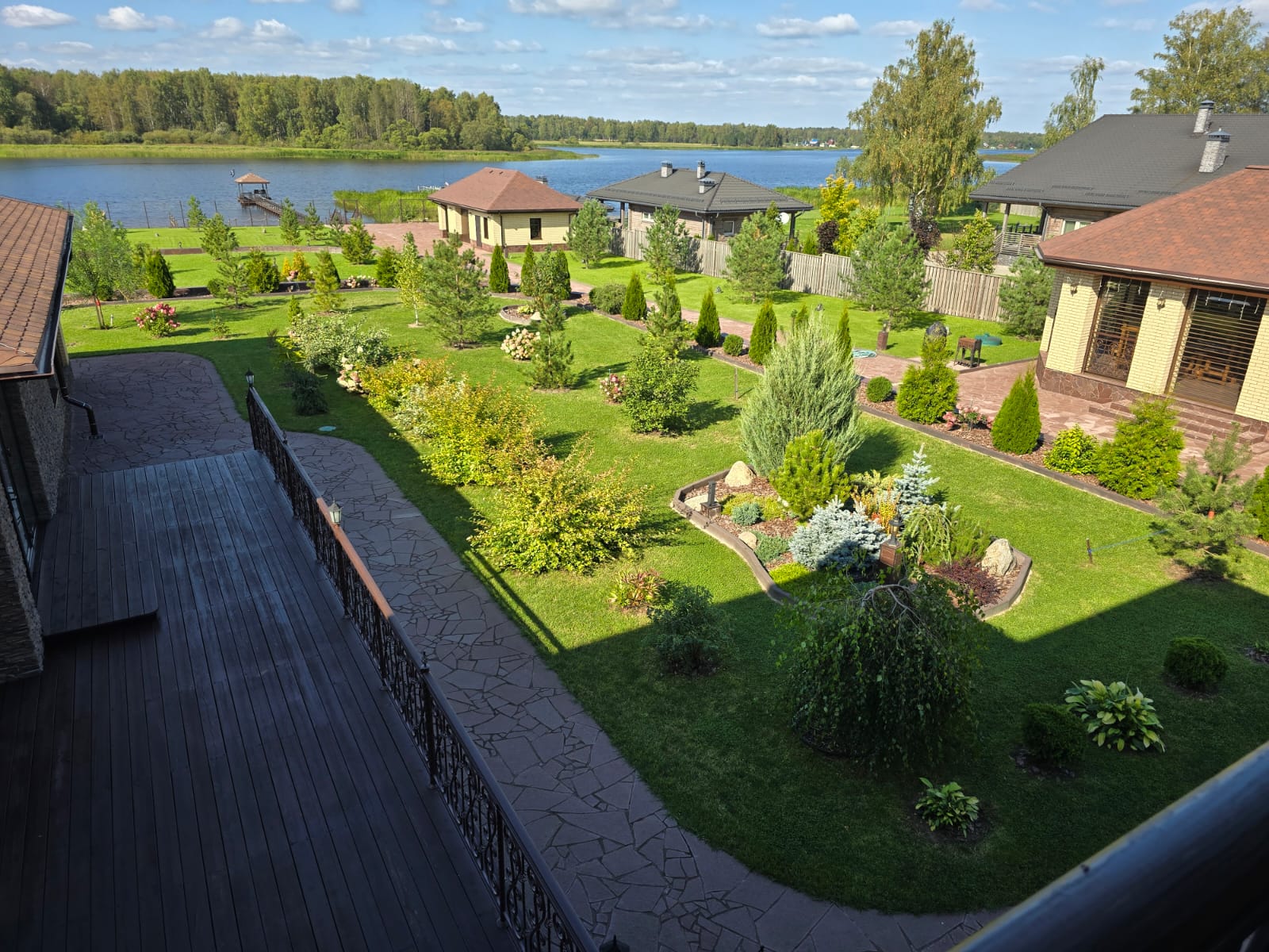 Участок оформлен ландшафтным дизайнером, разбит сад с плодовыми деревьями, все дорожки и перепады высот вымощены природным камнем. На всей территории ведется видеонаблюдение, ТВ и интернет. На участке имеется игровой комплекс для детей. Вся территория освещается. Есть большая зона отдыха на берегу, причал с беседкой.