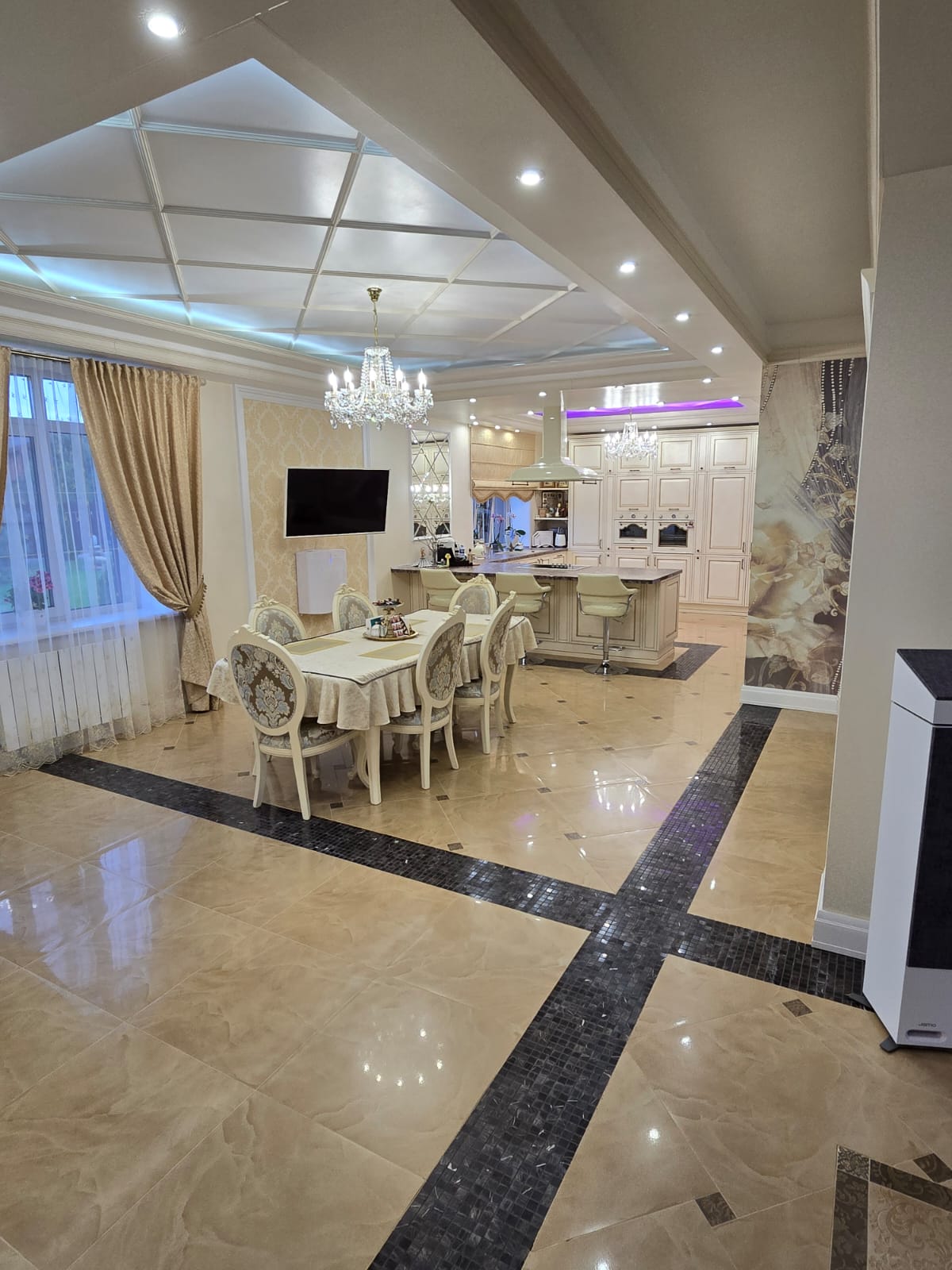 - 1-й этаж - просторная парадная гостиная со вторым светом объединена с кухней, выполнена в классическом итальянском стиле, кухонная мебель с островом и встроенной техникой SMEG; домашний кинотеатр, тематическая комната отдыха в русском стиле, и выход в СПА-зону, где находится бассейн, душевая, финская сауна.